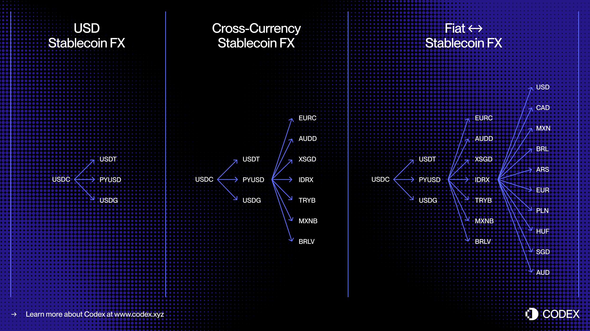 - Complementing this core technology, Codex Avenue is a global liquidity and FX hub that connects onchain and real economies. It simplifies local on/offramp, as well as stablecoin swaps, enabling frictionless movement between stablecoins and fiat across markets and currencies.